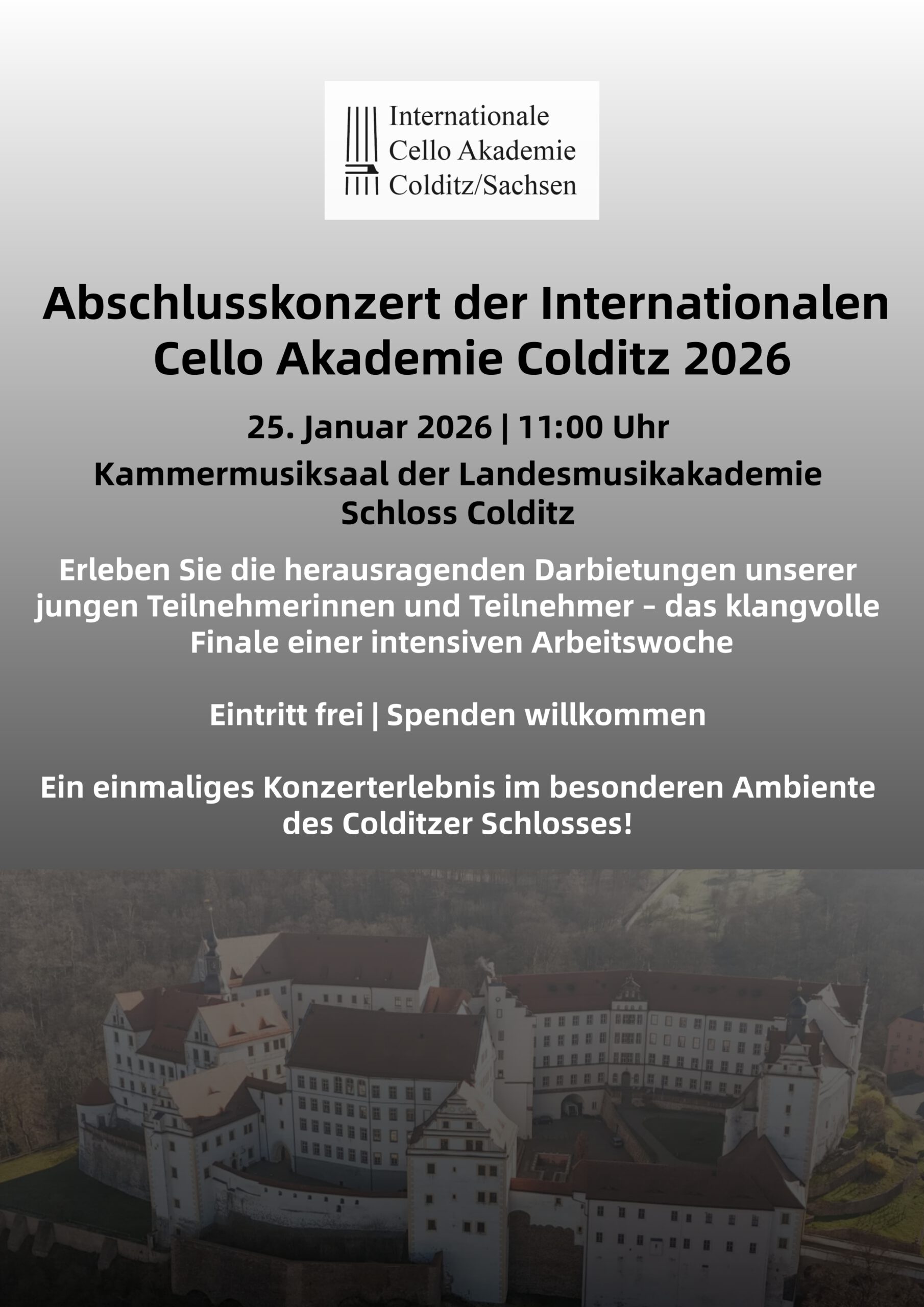 Vom 20. bis 25. Januar 2026 wird die Landesmusikakademie Sachsen zum internationalen Treffpunkt für junge Cellotalente aus Deutschland und der ganzen Welt.